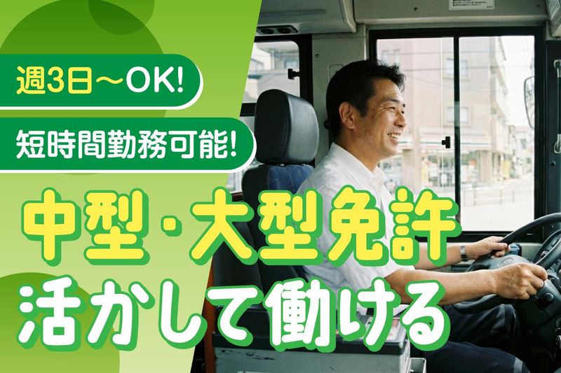 仕事内容 ━━━━━━━━━━━━━━━━━━━━ ✅駅から職場までの決まったルートを運行 ━━━━━━━━━━━━━━━━━━━━ ◆朝夕中心の運行・短時間勤務の相談も可 ◆長距離運転なし・シニア世代も活躍中 ◆中型または大型免許を活かして働ける ◆送迎業務以外は簡単な倉庫内補助作業のみ ◆週3日から勤務可能、土日祝はお休み 【仕事内容】 駅から職場までのスタッフの運行業務を お任せします。 ⭐朝便:7時30分~10時30分(3運行) ⭐夕便:15時30分~18時30分(3運行) 朝夕の運行時間以外に勤務可能な方は、 倉庫内での簡単な補助作業を 担当していただきます。 (空きダンボールの整理、商材の移動など) ━━━━━━━━━━━━━━━━━━━━ ✅時間に追われにくい運行スケジュール 運行時間と便数があらかじめ 決まっているため、 次の予定に追われるような 慌ただしさはありません。 また、固定ルートでの運行となるため、 落ち着いて安全確認をしながら 業務に取り組めます。 ━━━━━━━━━━━━━━━━━━━━ ✅自分のペースで続けられる仕事 勤務時間は柔軟に相談でき、 【朝便のみ】【夕便のみ】の勤務も可能。 運転の経験や免許を活かしながら、 無理なく、自分のペースで 働き続けやすい環境です。 フルタイムでの勤務を希望される方は、 朝夕の運行時間の合間に、 倉庫内での簡単な補助作業を 担当することもできます。