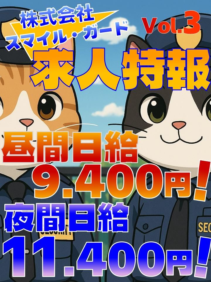 【保険制度】 雇用保険、労災保険、健康保険、厚生年金 待遇・福利厚生 【福利厚生】 【法定福利厚生制度】 ✅夏季手当追加支給中 ・通常の日給に400円がプラスされています ✅資格取得用支援制度 ・受験代は弊社が負担、取得すれば手当が発生して給与UP ✅制服貸与 ✅一部装備品貸与 ✅ペット相談可の隊員寮あり『入居には規定有』 ✅日払いOK ✅週払いOK ✅正社員登用あり
