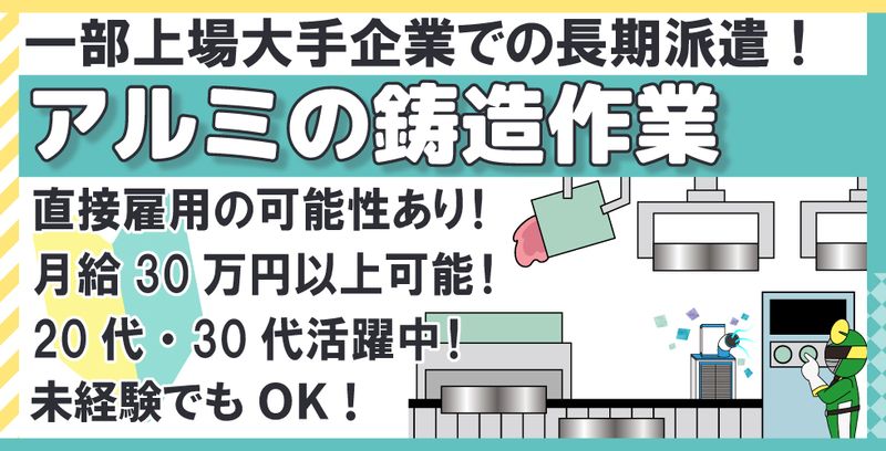 仕事の内容 【大手アルミ製造メーカーでのお仕事!】 ●20代・30代の男性活躍中! ●直接雇用の可能性あり! ●ガッツリ稼ぎたい方にオススメ! →月給30万円以上! 【お仕事内容】 ビール缶や航空機・新幹線のボディー等の材料となるアルミ板を製造する大手企業でのお仕事です(^^)/ アルミ製品の鋳造作業をお任せします。 大きなアルミ板の製造オペレーターのお仕事です。 アルミ板の原料となる大きな塊(インゴット)の製造工程を担当して頂きます。 機械を使用して型に原材料となる溶けたアルミを流し込む ↓ 完成した冷却済のアルミの塊(インゴット)を取り出す 取り出しの工程などは機械がしますので、カンタンな機械操作をするだけでOK! 鋳造現場ということもあり気温が高い環境ですが、スポットクーラーの設置やドリンク・塩飴の無料供給など熱中症対策がしっかりとされた現場でのお仕事ですのでご安心ください(*^-^*) 製造業未経験者活躍中! 分からない部分があればていねいにレクチャーしますのでご安心下さい(^^♪ 高時給1,600円のお仕事! 月給30万円以上稼げます! シフト制のお仕事ですが、年末年始や夏季には長期休暇がありますよ♪ 直接雇用の可能性がある現場です! 一部上場大手企業メーカーで長く勤めたい方必見の求人です(^-^) 【ポイント】 ●一部上場優良企業でのお仕事! ●20代・30代の男性活躍中の現場! ●シフト制! ⇒3勤1休、3勤2休の繰り返しになります 予定がある日はもちろん調整可能! お盆や年末年始には大型連休もあります! ●未経験者OK! ●飲料水・スポーツドリンク飲み放題! 塩飴も無料! ●食堂あり! ⇒美味しい社員食堂があります♪ 電子レンジや冷蔵庫なども完備! ●ロッカールーム・休憩室あり! ●制服貸与! ●マイカー通勤可能!無料駐車場完備! ●受動喫煙対策あり(喫煙室設置) ★本求人にご興味をお持ちの方は、応募する!より必須項目記載の上、 お問合せ下さい。 (お電話でのお問合わせ先:0120-67-3244 ※平日9時00分~18時00分)