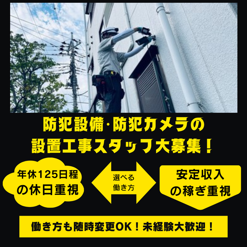 仕事内容 ✨週休二日制で働きやすい!✨ 大手セキュリティー会社「セコム」の 機器設置工事を行っています。 防犯への関心が高まっているからこそ 仕事が増加しています。 まずは道具の名称や使い方を覚え、 仕事の流れを覚えましょう。 その後徐々にお任せする仕事を 増やしていきます! 具体的には ・防犯カメラ ・防犯センサー ・インターフォン などのホームセキュリティ機器を 設置するお仕事になります。 ~ある1日の流れ~ 09:00 現場にて挨拶 打ち合わせ KYミーティング 作業開始(10:00休憩) 12:00 昼休憩 13:00 午後作業開始(15:00休憩) 17:00 片付け・作業終了して事務所に戻って報告したら帰宅! (作業状況により残業あり、早く終了する日もあります) <安心してスタートできますよ!> 個人宅へ伺うことが多く社員皆 営業職のような口調の方が多いです。 職人さん気質の方ではなく、強い口調が 苦手な方でも安心して働けます。