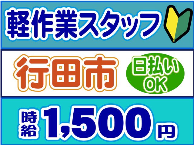 仕事内容 長期で安心安定、カンタン軽作業 初心者さんもしっかり稼げる高時給案件 休みもしっかりでメリハリよく働けます 「工場作業員のポイント」 〇未経験OK 〇高時給1500円 〇人気の軽作業 〇日勤のみ・土日祝休み 〇車通勤OK(無料駐車場有) 〇20代30代40代の男性活躍中 〇日払いOK(規定内) 〇履歴書不要 〇交通費支給(規定内) 〇「マイリク定着支援」導入企業! 【工場作業員スタッフの仕事内容】 行田市にある消毒用アルコールや 溶剤の製造のお仕事です。 具体的には・・・ ・充填作業の補助 ・出荷品のラベル貼り ・箱詰め ・パレット積み などをお願いします。 職場見学(30分~1時間程度)を実施しております。 実際に作業内容を見てから決めていただけます! 【勤務について】 ・日勤のみ(8時15分~17時15分 ※実働8時間) ・土日祝休みの週休2日制 急な発熱・体調不良・冠婚葬祭など、 突発的なお休みに柔軟に対応しております。 【こんな経験活かせます!】 下記経験者は前職活かせます。 ・製造工場パート・アルバイト ・軽作業パート・アルバイト ・製造補助・原料投入・充填パート・アルバイト ・ラベル貼り・シール貼りパート・アルバイト ・梱包・箱詰め・包装パート・アルバイト ・倉庫内派遣 ・主婦パート(職種不問) ・中高年パート 前職不問で採用しております。 ブランクのある方もOK、経験の浅い方もOK ご不明な点はお気軽にお問い合わせください。 お電話でのご応募、ご質問も受付中! 株式会社ロフティー 熊谷支店 担当営業、または採用担当まで TEL0800-222-6888(フリーダイヤル) お仕事情報などはこちら https://entori.jp/lofty-saitama コーディネーター・定着支援のWサポート体制導入 「マイリク定着支援」導入企業! アンケートで職場の様子を確認し、 コーディネーター・定着支援担当が連携してサポート。 はじめての派遣でも安心して働けるよう迅速かつ 丁寧にサポート対応いたします。