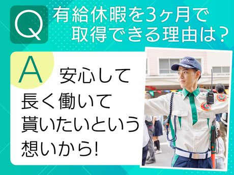 休日 アルバイトの方でも入社3ヶ月で、 有給の取得が可能です。 取りやすい雰囲気があるので、 取得率も高いんですよ◎ ――――――――――――――― 他支社スタッフの休日の過ごし方 ――――――――――――――― スポーツ/野球観戦/漫画/ゲーム/PC/ スロット/競艇/オートレース/釣り/ 動画鑑賞/映画/芸能/グルメ/料理/ インテリア/DIY/競馬/麻雀/パチンコ/ 旅行/お酒/散歩/クロスワード/数独 など グリーン警備で活躍するスタッフは 趣味を満喫している人が多いんです! 趣味友達ができた人も♪ 今回はオープニング募集なので、 みんな一緒にスタートだから 気の合う仲間にも出会いやすいですよ◎