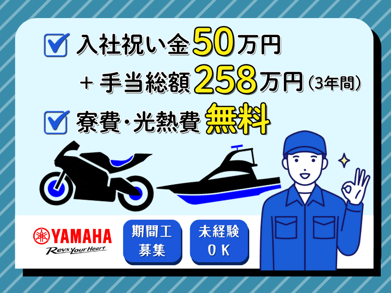 仕事内容 <ヤマハ発動機期間社員募集!> ✅土日休み・年間休日121日 ✅月収31万円以上可能 ✅3年総支給1300万円以上可能 (※交替勤務の場合) ✅単身寮あり(寮費・光熱費無料) ✅正社員登用制度あり! ✅20代~40代の未経験者が多数活躍中 ==================== ⭐入社祝い金50万円!⭐ 他にも満了感謝金、皆勤手当て、協力手当て の3年間合計で258万円の支給あり! ==================== 《✅仕事内容》 工作機械を使い、 エンジン部品(カバー、ケース類) を高精度に加工、組立します。 《仕事の流れ》 ①工作機械にエンジン部品をセット (カバー、ケース類) ②機械を操作して、部品を加工、組立 ③完成品を目視で検査 問題がなければ製品が完成! 業務はしっかりマニュアル化されているため 製造業のお仕事や検査業務が初めての方も 安心して始められる環境です! ✅正社員登用制度あり! 頑張りはしっかり評価。 未経験でも正社員を目指すことも可能です!