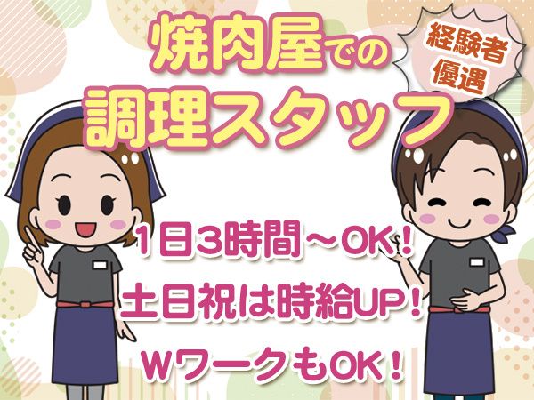 仕事内容 ・1日3時間から勤務OK ・土日祝は時給UP! ・人気の日勤勤務。 ・主婦(夫)・シニアの方OK ・パートアルバイト未経験者にもおススメ! ・調理経験者厚遇 ・フルタイムもOK(12:00~22:00) ・学生(高校生も)・主婦(夫)・フリーター Wワーク・副業希望・飲食店、調理経験者の方も活躍中。 【仕事内容】 焼肉南大門での【調理】をお任せ致します。 主にお肉のカットをメインで行います。 また、お皿にお肉を盛り付けしたり、 簡単なおつまみやビールなどを出したり、 厨房の洗い場等の清掃もお願いしたりもします。 調理に興味のある方、 飲食業や調理経験のある方お待ちしております。 学校終わりやお休みの高校生から、 子育て中の主婦(夫)さん、 又は手の空いた主婦(夫)パートさんや 40代・50代・60代などの中高年や シニア等の幅広い年齢層が活躍しております。 定年後の方のお力も借りております。 難しい作業はなく作業に特別な体力は 必要ありませんのでご安心ください。 土日祝休み希望や短期で働きたい方にもおススメ! マイカー・自転車・バイクなどの通勤が可能です。 ハローワークにも同時掲載中です。 ハローワーク経由で応募したい場合方もご連絡下さい。