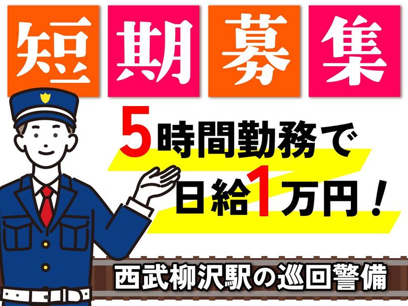 仕事内容 <<オープニング案件の短期勤務 !>> \\ 早朝のみ!週2日~OK! // 駅構内での巡回警備スタッフ募集! 年齢・性別・経験一切不問! 男性も女性もシニアも活躍できるお仕事です。 ※18歳以上(警備業法により) ◇ オススメポイント ◇ 〇 早朝短時間で効率よく稼げる! ⇒ 3:30~8:30の勤務で日給1万円! ⇒ 午前中で仕事が終わるので、Wワークや私生活との両立も◎ 〇 短期採用(3か月~半年) ⇒ 期間限定で働きたい方歓迎! ⇒ 気軽に始めやすい短期のお仕事です。 〇好きな時に働ける!週0日もOK! ⇒無理なく働けると在籍スタッフに大好評! ⇒仕事が休みの時だけやお金が必要な時だけもOK! 〇面接率100%!全員と面接します! ⇒全員とお会いしたいから電話や書類選考は一切なし! ⇒採用基準は「人柄」だから採用率99%! ー < 仕事内容 > 西武柳沢駅構内での巡回警備業務をお願いします。 ー具体的にはー ・駅構内の巡回、見回り ・利用者の安全確認 ・簡単な案内対応 など。 難しい業務はありません。 現場に出る前にしっかりとした事前研修があるので、未経験の方でも安心してスタートできます。