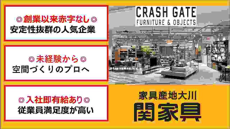 仕事内容 【仕事内容】 多様な商品の企画から開発・販売までを 自社で手がけるインテリアブランド「CRASH GATE」にて、 家具を中心としたトータルコーディネートのご提案・接客販売をお願いします。 お客様の理想の住まいづくりをサポートする、非常にやりがいのあるポジションです。 <具体的な業務内容>■ コンサルティング型の接客販売 ご来店されたお客様のニーズや好みをヒアリングし、最適な家具をご提案します。 間取りやライフスタイルをお伺いし、 商品の特徴(素材や耐久性、お手入れ方法など)を詳細にご説明しながら、 お部屋全体のコーディネートを一緒に考えていきます。 ■ 長期的な信頼関係の構築 暮らしの中で長く使っていく家具だからこそ、 1日でお買い上げいただくとは限りません。 中には半年間かけて何度もご来店いただき、じっくりとお話しを重ねることも。 「一回限りの接客」ではなく、お客様と自然と距離が縮まり、 深い信頼関係を築けるのがこの仕事ならではの楽しさです。 ■ 納品までのアフターフォロー 商品をご購入いただいたお客様へ、 入荷状況や配送日程のご案内など、 細やかなサービスを提供します。 丁寧なフォローがリピート率の向上や、 「あなたから買いたい」という嬉しいお言葉に繋がります。