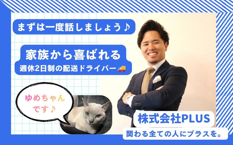 仕事内容: \\オープニング ドライバー大募集 // 前に軽貨物ドライバーに挑戦したけど、 全然稼げなくて、嫌になってしまった…という人は是非当社へ。 もちろんドライバー未経験の方も大歓迎です!! 《こんなお仕事をお任せします》 通販商品などを企業や個人宅へ届けていただきます。 商品も片手で配送できるものがほとんど。 配送エリアも狭く、固定のルートなので未経験者もすぐ覚えられます(^^) 月収60万以上まであなたの得たい収入のレベルに合わせて、 サポートさせて頂きます! 《ドライバーの1日の流れ》 8:00 営業所到着!荷物の積み込みを行う 9:00 配達開始 その前にコンビニで一服 12:30 お昼休憩 車内でYouTube見ながらご飯。 14:00 午後の荷物の積み込み!でもその前に一旦一服 16:30 休憩 YouTubeまたは昼寝というか夕寝!? 19:30 夜の時間指定の荷物を配り終え終了。 *早ければ19時過ぎに終わっている方もいます。 はじめまして!代表の細川です! 株式会社PLUSは「関わる全ての人にプラスを。」 をミッションに立ち上げた会社です。 今まで上手く行かなかった人でも、何かに挫折したことがある人でも、 「頑張ったら報われたと感じる人」を増やしたいと思い、 どんな人でも頑張れば報われる業界に魅力を感じ、軽配送業界に参入しました! なぜそう思ったのか? 私自身の今までの経験からそのような想いが芽生えました。 富山県で生まれ育ち、就職を機に上京をしてきました。しかし、田舎育ちの私は東京の雰囲気にはじめなじめないことがあり、最初の就職先も1年で退職し、アルバイト生活。 もともとイメージしていた東京で生活とかけ離れ、何もできない自分に鬱になり、 「才能ある人しか活躍したり、理想の生活は送れない」と感じてしまうようになりました。 そこから知人の紹介経由で営業を始め、過酷&教育のある環境でトップセールスになることでき、 話すの苦手だった自分でも環境や出会いで変われると感じました。 この経験を通して、前の自分と同じように何かうまくいかなかったことから自分を肯定できなくなっている人などを助けたい、頑張ったら報われたと感じる人を増やしたいと心の底から思っております。 ぜひ何かに悩んでいる方、何かしたいと思っている方、ご応募お待ちしております!! また、少しオフの部分も紹介できればと思います。 私は猫を飼っており、毎日の癒しです(笑) 旅行なども好きで、バックパッカーをしたりすることもあります。シーシャやサウナも好きなので、会社の仲間や取引先の方ともよく行きます!! 色々と書かせていただきましたが、何か少しでも気になることや、話でも聞いてみたいという方はご連絡、ご応募お待ちしております!! 面接ではあなたのやりたいことも踏まえて、軽貨物の仕事の楽しさ、大変なことをリアルにお話しします。 納得した上で一緒に働いていただけたら嬉しいです。ご連絡をお待ちしています!