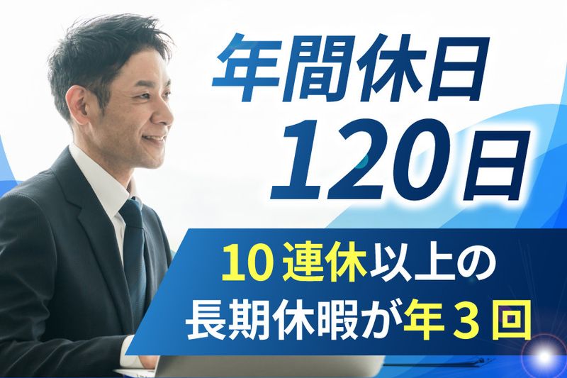 【休日休暇】 週休2日制(土日祝) ※土曜出勤は月に1回程度。年間休日はしっかり120日以上。無理のない働き方を実現できます。 【長期休暇あり】 ・GW(10連休) ・夏季休暇(9連休) ・年末年始(10連休) ■年間休日120日以上! ■産休・育休もあります!(取得実績あり) 【有給休暇あり】 現在当社では、有給休暇の取得促進・消化率向上に取り組んでいます。家族でのご旅行やお子様のイベント(授業参観や運動会など)がありましたら、ぜひ有給休暇を活用してください!