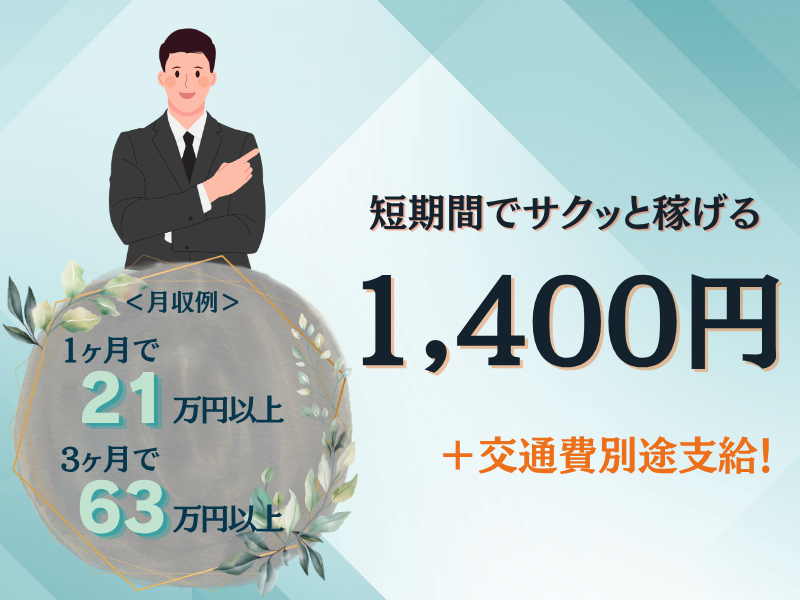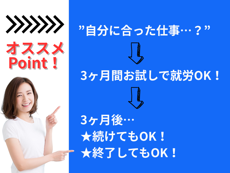アピールポイント: ================= 高時給1400円で3ヶ月集中して稼げる! ================= 次のお仕事まで、つなぎのお仕事として 短期間でサクッと稼げます! ================= お試し体験で働いてみる! ================= 「自分に合った仕事かやってみないと分からないので いきなり長期勤務は不安だな‥」という方も大歓迎! 自分に合ってるなと思われたら、 長期に切り替える事ができます★(規定あり)