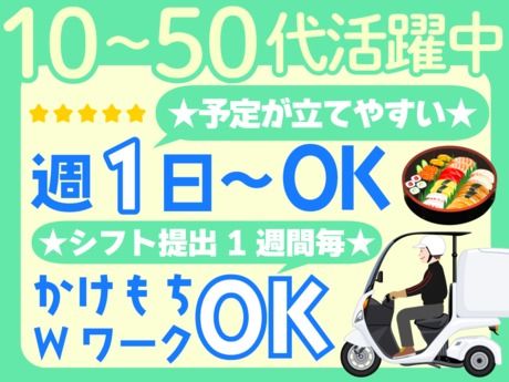 資格 \4月以降も勤務できる方歓迎!/ 未経験歓迎☆Wワーカー・主婦(夫)活躍中☆ 【以下に当てはまる方、歓迎!】 ● 柔軟なシフトで働きたい方 ● Wワーク先を探している方 ● 本業に+αの収入が欲しい方 【必須】原付免許または普通自動車免許 (原付免許のみの方は取得から6ヶ月以上) ★初バイト大歓迎★ バイクの運転操作・道順も 丁寧にサポート! \こんな方にもオススメ/ 販売・接客関連のお仕事をしたことがある方 接客スキル・接客マナーを磨きたい方 デリバリー経験者、バイクの運転が好きな方 Uターン・Iターン希望の方 子育て卒業により社会復帰・職場復帰をお考えの方 ママさんスタッフ・パパさんスタッフ 学生・フリーター・中高年・シニアが働いている職場をお探しの方 スキルアップ・キャリアアップしたい方 短期(3か月以内)で働きたい方