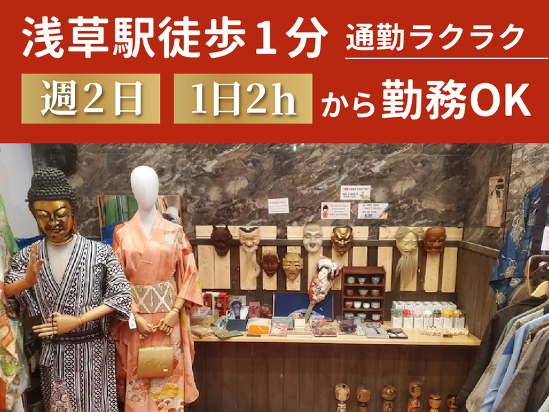 仕事内容 ~*海外からのお客様がほとんど!*~ 浅草にあるアンティーク着物ショップで 英語での接客ができる方を大募集✨ ⏩着物の知識も読み書きスキルも不問♪ ⏩週2日~&1日2時間~勤務OK◎ ⏩英語スキルを活かしたい方大歓迎! *~*~*~*~*~*~*~*~*~* アンティークのお着物を扱うお店で 接客販売業務をお任せします◎ ▼具体的には… *販売・レジ対応 *英語での接客対応 *店頭での呼び込み …などをお願いします! *~*~*~*~*~*~*~*~*~* ✅英語スキルを活かせる!  ̄ ̄ ̄ ̄ ̄ ̄ ̄ ̄ ̄ ̄ ̄ ̄ ̄ ある程度英語で日常会話ができればOK! 英語での読み書きスキルは不問です。 海外からいらっしゃるお客様が多いので 英語での接客にチャレンジしたい方や 英会話スキルを活かして働きたい方 などにピッタリの環境です♪ ✅着物の知識は必要ナシ◎  ̄ ̄ ̄ ̄ ̄ ̄ ̄ ̄ ̄ ̄ ̄ ̄ ̄ 着付けの方法や小物の名前、 着物の種類などについての知識を 知らないまま入社しても大丈夫♪ 必要な知識はもちろんのこと、 レジ操作など業務についてもイチから 丁寧にお教えするのでご安心ください! *~*~*~*~*~*~*~*~*~*