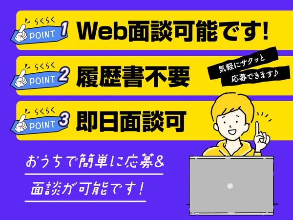 選考フロー \当社の選考フローについて/ ・履歴書不要! ・面談1回! ・即日面談も実施中◎ すぐに働きたい!応募したい! そんな貴方を歓迎します♪ 【 選考の流れ 】 ▼WEBまたはお電話でご応募 お急ぎの方、直接話したい方は下記番号におかけください! 0120-1040-99 受付時間:平日 9:15~19:00 ▼面談日の調整(10分程度) ご応募後、担当者よりメールまたはお電話にてご連絡いたします。面談日時について、ご都合の良い時間をお知らせください。 平日10:00~17:00の応募に関しては、1時間以内にお電話いたします。 ▼面談 オンライン面談(WEB面談)または対面面談を行います! スマホでのご参加OK! ▼採否連絡(即日~2日) 入社日等は応相談ください。 ご応募お待ちしております!