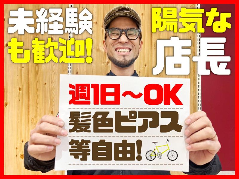 求めている人材 ●未経験者歓迎 ●Wワーク・かけもちOK ●フリーター歓迎 └正社員登用もあり ●扶養内勤務OK ●大学生活躍中! └進路決定済み高校3年生OK ●男女不問・学歴不問(中卒・高卒歓迎) ●初バイト・バイトデビューOK! もちろん自転車に関する知識はなくてOK♪ 自転車に関して何も知らなかったスタッフも 今は中心メンバーとして活躍しています! 現在は大学生・フリーターを中心に活躍中◎ テスト期間などのシフト相談も可能です! 「自転車が好き・興味がある」 「優しい店長の下で働きたい」 「家の近くで働きたい」 など理由は何でもOKです(^^)/ 平日2~3名、土日祝4~5名の勤務です。 安心して働いていただけるよう、 社員が常時いるようにしています! 分からないことや不安なことがあれば なんでも聞ける環境ですよ♪