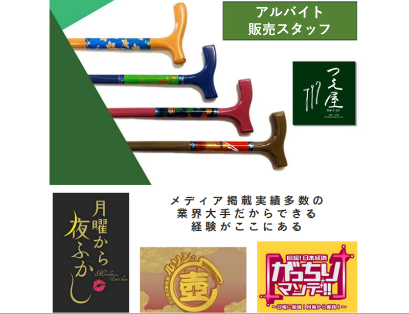 仕事内容 ┏──────────────────┓ \\来春オープン// オープニングスタッフ募集 万博に出店中で業界最大手の 『つえ屋』での 販売スタッフの募集です。 ┗──────────────────┛ \アピールポイント/ ✅シルバー世代応援♪ ✅シニア世代応援♪ ✅女性活躍中♪ ✅フルタイム歓迎 メディアで話題の「つえ屋」で あなたの経験を活かしませんか? 未経験の方やブランクがある方も活躍中! ▍お仕事について  ̄ ̄ ̄ ̄ ̄ ̄ ̄ ̄ ̄ ̄ ̄ ̄ ̄ ̄ ̄ ̄ ̄ ̄ ̄ ̄ 店舗での接客販売などをお願いします! 《具体的には》 ✅ご来店されるお客様への接客 ✅お電話のお問い合わせの対応 ▍つえの知識がなくてもOK♪  ̄ ̄ ̄ ̄ ̄ ̄ ̄ ̄ ̄ ̄ ̄ ̄ ̄ ̄ ̄ ̄ ̄ ̄ ̄ ̄ 研修制度もあり、先輩が丁寧に教えますので 知識がない方も安心して始められますよ◎ ▍当社の魅力  ̄ ̄ ̄ ̄ ̄ ̄ ̄ ̄ ̄ ̄ ̄ ̄ ̄ ̄ ̄ ̄ ̄ ̄ ̄ ̄ ニッチな業界で急成長中の当社、 多数のテレビ番組に取り上げられるなど 業界を変えたいという社長の思いや ユーザーの願いを「つえ・ステッキ」を 通して実現させる実行力が魅力です。 今後も多数の事業展開を考えている為 あなたのお力をぜひ貸していただけませんか? ▍入社後は、、  ̄ ̄ ̄ ̄ ̄ ̄ ̄ ̄ ̄ ̄ ̄ ̄ ̄ ̄ ̄ ̄ ̄ ̄ ̄ ̄ 研修期間中は京都の丸太町新本店にて 勤務していただきます。