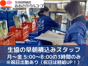 PR ==================================== 「月~金」で「早朝5~8時」の3時間だけ 車・自転車・バイク通勤OK 駐車場あり◎ 本業前のWワークや副業に・子育ての合間に◎ 時短でも【月収8万円以上】の収入が可能 (時給1378円×3時間、月21日勤務の場合の月収例86814円 ) 祝日勤務のご褒美 【時給100円アップ】あり 重たいものは台車のまま積み込めるから楽々 自分のペースでモクモクと作業できます 面接は1回だけ 私服で気楽にお越しください◎ ==================================== 「本業の前の空いた時間に稼ぎたい」という自営業の方や 「子どもが中学校に入ったので」という主婦さん&主夫さん、 「家の近所で短時間だけ稼ぎたい」というフリーターさん、 「ジム通いの代わりに丁度いい」というミドル世代の方まで 男女ともに幅広い層の方にご活躍いただいています。 早朝の短時間を有効活用しながら、安定収入が得られます◎