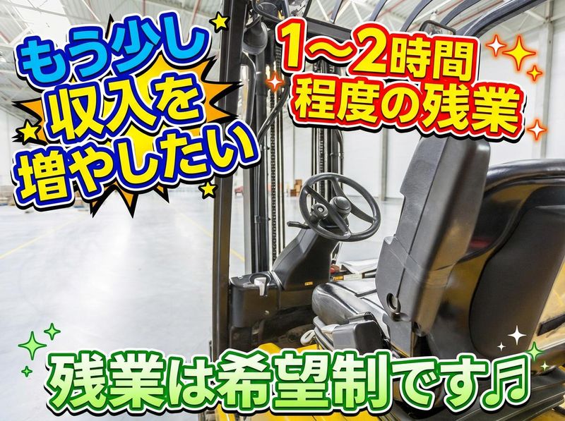 仕事内容 ★━━━━━━━━━━━━━━━★ ✨夜勤で安定収入を目指せる✨ 重い物一切なしの軽作業 ★━━━━━━━━━━━━━━━★ 扱うのはチョコレート菓子。 温度管理が徹底された 倉庫内作業をお願いします♬ ❏ 主な業務内容 ・フォークリフトでの積み込み ・商品の仕分け など ★〓★〓★〓★〓★〓★〓★〓★〓★ ✨ この現場のポイント ✨ ★〓★〓★〓★〓★〓★〓★〓★〓★ ✅ 夜勤で安定して働けます  ̄ ̄ ̄ ̄ ̄ ̄ ̄ ̄ ̄ ̄ ̄ ̄ ̄ ̄ 21:00~翌7:30の夜勤勤務。 夜の時間を活かして 働きたい方にぴったりです♬ 業務状況により1~2時間程度の 時間外勤務が発生する日もありますが、 は希望制です!! 深夜・時間外手当がつくため、 しっかり収入を確保したい方に◎ ✅重い物は一切ありません  ̄ ̄ ̄ ̄ ̄ ̄ ̄ ̄ ̄ ̄ ̄ ̄ ̄ ̄ 扱うのはチョコレート菓子など! フォークリフト中心のシンプル作業です♬ 「久しぶりのフォーク作業で不安…」 という方も、業務は 順を追って覚えていただけます。 無理なくスタートできる環境です! ✅ 空調完備の快適倉庫  ̄ ̄ ̄ ̄ ̄ ̄ ̄ ̄ ̄ ̄ ̄ ̄ ̄ ̄ チョコレート菓子を扱うため 倉庫内は温度管理が徹底されています。 夏は涼しく、冬も冷えすぎない環境で 一年を通して働きやすい職場です! ✅ 週4日~勤務OK  ̄ ̄ ̄ ̄ ̄ ̄ ̄ ̄ ̄ ̄ ̄ ̄ ̄ ̄ 安定してシフトに入れる方歓迎◎ 週5日勤務できる方は特に歓迎!! 夜勤で安定収入を目指したい方、 フォークリフト資格を活かしたい方、 まずはお気軽にご応募ください★