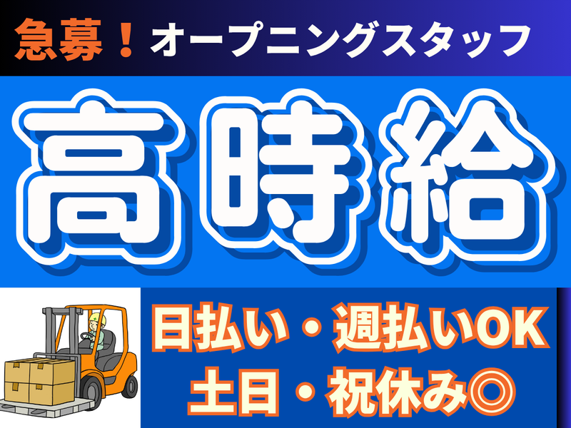 職場環境 ・20〜40代の男性スタッフを中心に活躍中 ・オープニングのため、みんな同じスタートラインで安心! ・未経験の方には研修あり/経験者は即戦力として優遇 ・ピカピカの新倉庫&冷暖房完備で快適◎