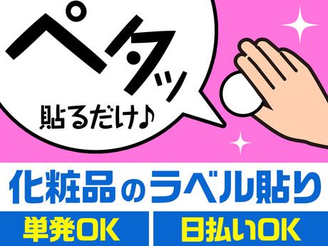 仕事内容 化粧品のラベル貼り /////////////////////////////////////// (σ'u')σ【全額日払い・現金手渡しOK】 スグに働きたい方にもピッタリ◎ /////////////////////////////////////// 百貨店向け化粧品のラベル貼り・セット作業をお任せします☆ 具体的には・・・ 化粧品の箱や容器にラベルを丁寧に貼り セット商品を組み合わせて出荷準備を行う「セット作業」が中心です。 作業手順は丁寧に教えてもらえるため、未経験の方でも安心して始められます。 細かい作業が得意な方、集中してコツコツ作業を進めたい方におすすめのお仕事♪ 体力的な負担も少なく働きやすい環境! サポート体制も充実しています◎ ぜひご応募ください!! アピールポイント ===== ★<POINT>★ ===== ■全額日払い・現金手渡しOK(規定あり) ■単発・短期~長期まで自由自在! ■派遣デビューの方も大歓迎♪ ■未経験・お仕事ブランクOK ■履歴書・来社不要で登録可能♪ ■シフトはスマホから申請楽々! ■初勤務手当支給有り ================== あなたの理想の働き方をご相談ください♪ 「平日だけ働きたい」 「Wワークで土日だけ」 「子どものお迎えまでの時間がいい」 「効率よく稼げる夜勤がいい」 「長期休暇中だけフル勤務したい」など どんなご希望も相談OK! プライベートも大切にできる働き方を一緒に探しましょう! 「応募する」ボタンから、 お気軽にお問い合わせください☆彡 登録までの流れをご紹介 ┏━━━━━━━━━━┓ たったコレだけでOK! ┗━━━━━━━━━━┛ (1)『応募する』ボタンをタップ!*24時間OK! (2)メール記載のURLより登録会の予約をお願いします! (3)面談でしっかりご説明します!これで登録完了♪ ☆お友達との応募も大歓迎! ☆紹介可能案件数は業界TOPクラス! まずはかんたん登録♪ WEB面談OK◎ オンラインだけでは不安な方は、来社登録会も実施中です!