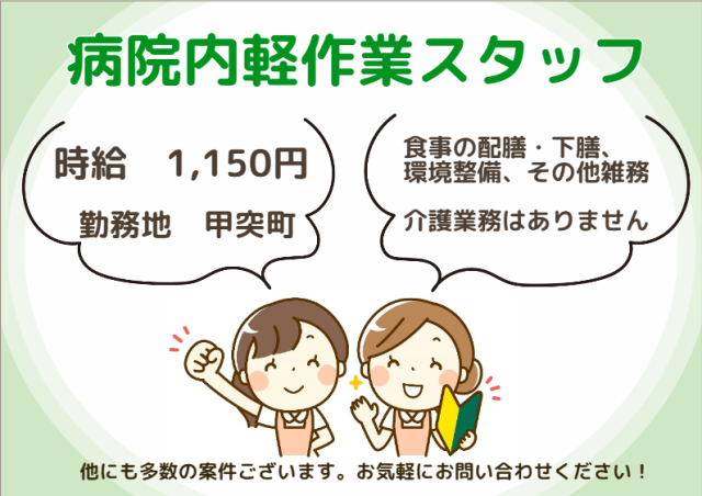 募集要項 職種 病院内軽作業業務 雇用形態 契約社員 / 派遣社員 仕事内容 食事の配膳・下膳、環境整備、物品管理、その他雑務全般をお願いします。