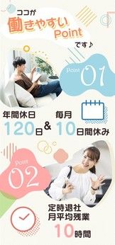 休日 日曜日固定,他シフト ★年間休日120日 ※年末年始は12/31PM~1/4迄お休み ■月10日休み ■バースデー休暇あり