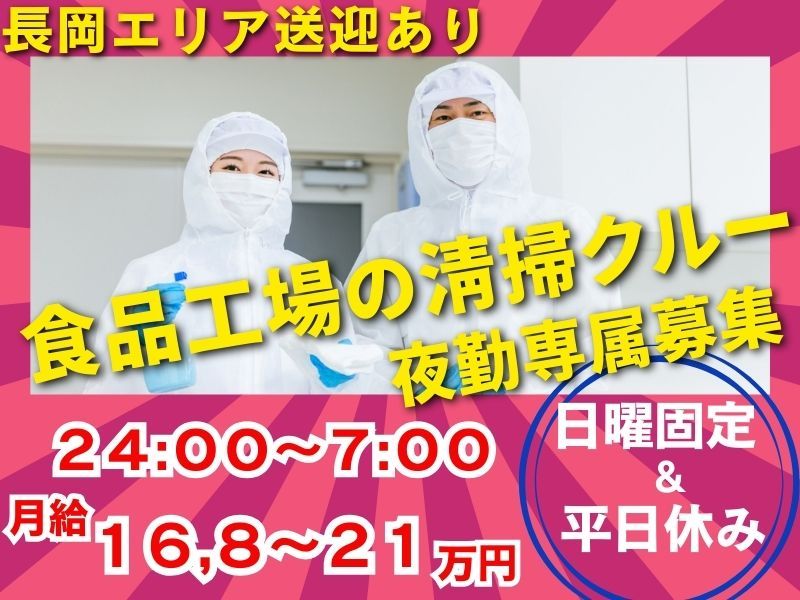 仕事の内容 \この仕事のポイント/ ★未経験から始められる 食品工場やハウスクリーニングの洗浄・清掃スタッフ ★夜勤で安定収入 0:00~7:00/週5~6日勤務/日曜+平日休み ★ライフスタイルに合わせて働ける 休みを重視する働き方も、しっかり稼ぐ働き方も選択可能 ★契約社員採用 安定して長く働ける 【仕事内容】 食品工場の製造機械の洗浄や、建物のワックスがけ、エアコンの清掃を担当する仕事です。 食品工場での洗浄作業 ・製造機械や調理器具を高圧洗浄機で洗浄 ・油汚れや強いにおいが少なく、作業環境が整っている ハウスクリーニング ・床のワックスがけ、エアコンの清掃など建物のメンテナンス ・清潔な環境を整える仕事 未経験でも安心の研修あり 入社後はチームで作業を行い、約1~2週間で業務の流れを覚えられる。経験豊富なスタッフがサポートするので、初めての方も無理なく仕事を始められる。 【こんな方に向いています】 ・人と接する機会が少ない仕事を探している方 ・集中して作業を進めることが得意な方 ・夜間の時間を有効に使い、安定した収入を得たい方 【職場の特徴】 ・社員6名、アルバイト10名以上が在籍 ・未経験から始めたスタッフが多数活躍 ・フリーター、主婦、副業として働く方など、さまざまな働き方が可能 ・幅広い世代が活躍中 【働き方の選択が可能】 ライフスタイルに合わせた働き方ができる ・休みを重視する場合 → 月20日勤務 ・収入を重視する場合 → 月24日勤務 日曜は固定休み、平日はシフト制で予定に合わせやすい。 【勤務地・通勤について】 ◎長岡市・柏崎市・小千谷市のスタッフが在籍 ◎長岡市からの送迎あり、通勤の負担を軽減 ◎深夜勤務なので渋滞もなくスムーズな通勤が可能 【この仕事のポイント】 ◆食品工場や建物の清掃を行う仕事 ◆契約社員として安定した収入を確保できる ◆夜勤のため効率よく働くことが可能 ◆未経験からでも短期間で仕事を覚えられる ◆ライフスタイルに合わせて働き方を調整できる この仕事に興味がある方は、ぜひご応募ください。 【実就業場】 ◆テーブルマーク㈱魚沼水の郷工場様内 新潟県魚沼市十日町字八色原1687‐7 ※長岡市から送迎があるので、通勤は楽々です。