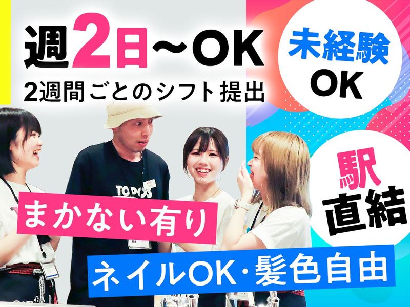 仕事内容 「駅から遠いと通うのが大変...。」 「雨の中で行くのは面倒...。」 皆さんのそのお気持ち、分かります...! アルバイト先の駅からの近さって大切ですよね! 『大衆酒場2.0 横浜とぽす』は横浜駅ナカ! 横浜駅の駅構内なので、 雨でも雪でも駅から出ずに出勤できちゃいます!♪ 通いやすさ抜群な 『大衆酒場2.0 横浜とぽす』で アルバイトデビュー、しちゃいませんか?.+☆* ■[注目ポイント!]□■□■□■□■□■ ◎オープン1周年のまだまだ新しいお店! ∟きれいな店内で働ける☆ ◎駅ナカなので通いやすさ抜群! ∟駅から外に出る必要なし! ∟暑くても悪天候でもお構いなし! ◎オシャレして自分らしく働ける! ∟髪型&髪色自由! ∟ネイルOK!(規定あり) ◎飲食で働くならやっぱりここは外せない! ∟人気店の絶品賄いあり! □■□■□■□■□■□■□■□■□■□ / 『大衆酒場2.0 横浜とぽす』は 2025年6月に1周年を迎えました!.+☆* \ まだまだ新しい当店をより一層盛り上げていくため、 一緒に働いてくれる仲間を募集します‼ 連日多くのお客様にご来店いただき、 店内はいつも笑顔と笑い声が絶えません! 働き始めたら楽しすぎて、 "趣味がバイト!"になっちゃうかも!?(笑) △▼△仕事内容△▼△ ★STEP1:まずは簡単なことからスタート!! ・盛り付け ・材料のカットや簡単な調理補助 ・洗い物やキッチン周りの片付け など ◎バイトデビューの方でも大丈夫! 食材の扱い方だって、包丁の扱い方だって、 先輩がしっかりフォローします♪ ★STEP2:仕事に慣れてきたら… ・ちょっとしたメニューの調理 ・おすすめメニュー作りにチャレンジ ・仕込みの段取りや盛り付けの工夫など ◎自分の作った料理でお客様を笑顔に♪ キッチンの主力メンバーとして お客様をHAPPYにしてください!