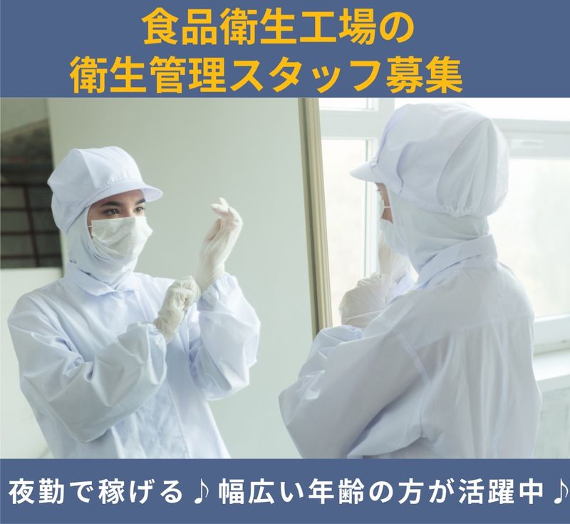 仕事内容 コンビニ向けの食品工場での衛生管理のお仕事です。 製造現場の方の衛生面でのサポート、工場内の清潔保持に従事していただきます。 〓〓 お仕事内容詳細 〓〓 ・製造現場で働く方の衛生管理のチェック ・現場に入場する従業員のローラー(コロコロ)かけ(ほこりや髪の毛等を除去) ・健康チェック、現場作業中の方へのローラーかけ(作業中巡回) ・廊下や手洗い場など、現場の共有場所の清掃 ・現場の温度管理 ・衛生品の在庫管理 などを担当していただきます。 〓〓 ここがポイント! 〓〓 << 未経験者OK! >> 食品製造経験が未経験の方でも担当できる作業です。 お掃除が好きな方にもおすすめ << 夜勤固定のお仕事! >> 夕方からの就業なので昼間の予定を立てやすい 夜勤専属で働きたい方におすすめです。 夜勤手当もついて稼げます! << 幅広い年齢の方が活躍! >> 重量物を運ぶなどはしない作業なので 若い方から年配の方まで幅広い年齢の方が活躍しています! 力に自信がない方も大丈夫 ※就業前に、職場見学が出来ますので見て納得、安心して働くことが出来ます。