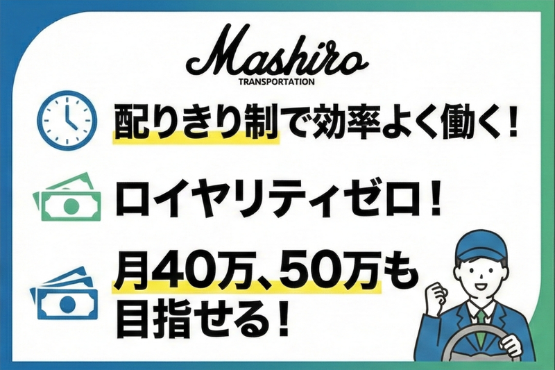 アピールポイント: ✅️オープニング特典 初期メンバー限定!単価+30円! ● 対面配達:180円/個(通常150円) ● 置き配:130円/個(通常100円) オープニングメンバーとして参加することで、これから増える荷物量の中で中心的な存在になれます。 初期メンバーには今後さらなるメリットがあるかも...! ✅️配りきり制で効率的 配り終わったら終了! 早く配れば早く帰れるので、自分のペースで働けます。 ※荷物の量によって終了時間は変動します。 ※大きい荷物がある日はピストン配送(積み直し)になることもあります。 ✅️ロイヤリティゼロ 普通の軽貨物配送では、売上の約20%を運送会社に支払うのが業界の常識。 でも当社はロイヤリティゼロ! 例えば: ● 月40万稼いだら → 通常なら8万円引かれる → 当社なら全額あなたのもの ● 月50万稼いだら → 通常なら10万円引かれる → 当社なら全額あなたのもの 頑張りがそのまま報酬に反映されるシステムです✨ ✅️将来は協力会社として独立も可能 個人ドライバーの方: 当社で経験を積んでいただくことで、協力会社として独立のお手伝いも可能! ● 黒ナンバー取得のサポート ● 荷主との繋ぎ ● 開業後も継続的に仕事を卸します ● 「自分で人を使って大きく稼ぎたい」方を応援します 既存の配送業者様: 即、協力会社として契約可能です。 インボイス取得済みの場合、単価+消費税で対応いたします。 ✅️これから伸びるエリア 新規エリアのため、現在は1日100個前後ですが、今後荷物量は増える予定! 初期メンバーとして参加することで、成長を一緒に作っていけます。 ✅️車両のリースも実施 お車を持っていなくても大丈夫! 車両リース対応しています✨