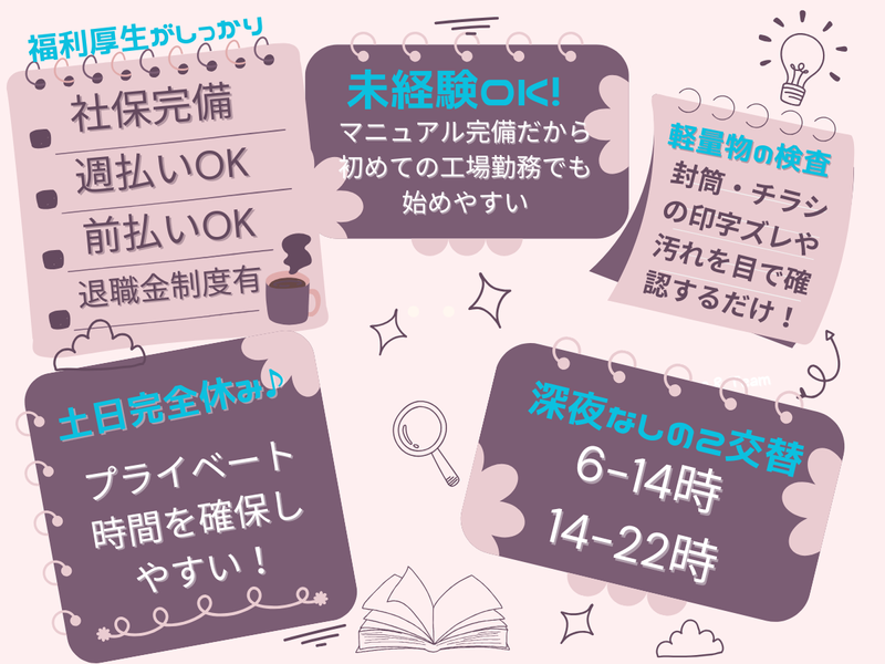 仕事内容 ━━━━━━━━━━━━ 【土日は完全に休める】 ━━━━━━━━━━━━ 土日は完全休み。 残業は月10時間程度。 平日のみ・週5日勤務です。 ━━━━━━━━━━━━ 【月収21万円以上が可能】 ━━━━━━━━━━━━ 時給1300円。 月収21万円以上も可能です。 安定した収入を 長期で得られる職場です。 ━━━━━━━━━━━━ 【工場未経験でも問題ない】 ━━━━━━━━━━━━ 最初は簡単な作業から スタートします。 マニュアルがあるので 手順通りに進めるだけです。 先輩スタッフが丁寧に教えるので わからないことは すぐに聞けます。 製造業の経験は不要です。 ━━━━━━━━━━━━ 【仕事内容】 ━━━━━━━━━━━━ 印刷された封筒やチラシに 印字ミスがないかを 目で確認する検査の仕事です。 印字のズレや汚れがないか 手に取って確認します。 封筒製造が中心のため 扱う製品は軽量です。 ━━━━━━━━━━━━ 【長く働ける職場です】 ━━━━━━━━━━━━ 長く働いているスタッフが 多数在籍しています。 腰を据えて働きたい方に 合っている職場です。