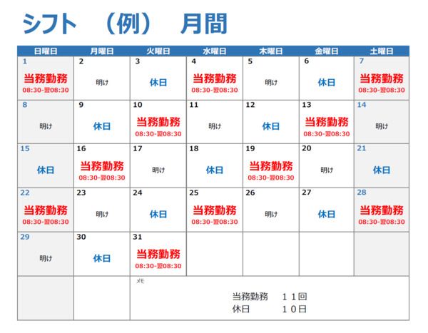 勤務時間 シフト制 8:30~翌8:30 実働時間: 1日あたり 18.0時間 ・実働18時間/休憩6時間 ・月10~11日のローテーション勤務、変形労働制 ※明け休みあり ※当務→明け休み→休み→当務→明け休み→休み→当務→… ・日勤、夜勤の勤務も可 ◎勤務日相談可◎ ◎2名体制のため休憩もしっかり取れます◎ 平均所定労働時間: 1日あたり 18.0時間