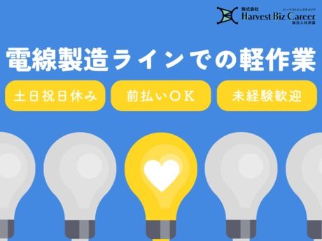 仕事内容 \電線製造ラインでのお仕事/ 【主な業務】 電線の切断、加工、検査、梱包などの業務をお願いします◎ ※製品の重さは5~10kg程度 お問い合わせだけでも構いません! ぜひお気軽にご相談ください★ 【職場環境】 ・20~40代の男女活躍中 ・未経験者活躍中 ・屋内 ・研修あり 【嬉しい前払い制度◎】 アプリで簡単申請可能♪♪ 急な出費があっても安心です! 【未経験でも安心!】 製造未経験でも大丈夫! 社員の方や周りの方が優しくフォローしてくれるので安心して挑戦できます♪ 簡単軽作業ですので、すぐに覚えられますよ◎ 【土日祝日休み◎】 土日祝休み&残業少なめ&有給休暇制度で メリハリを持ってお仕事もプライベートも充実させられます♪