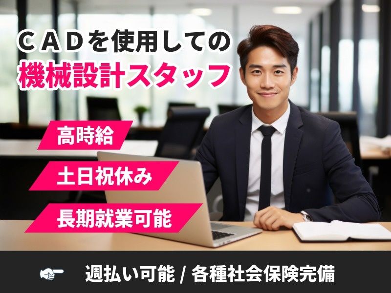仕事内容 〓〓 お仕事内容詳細 〓〓 CADを使用しての設計業務、設計図書の作成、又開発に関わる一連のお仕事です。 CADの実務経験と機械設計経験者を歓迎します! (CADの種別は問いません) 〓〓 ポイント 〓〓 ・経験者優遇 ・年齢不問 ・土日祝休み(企業カレンダーあり) ・高時給&多少残業ありで稼げます ・長期安定 〓〓〓〓〓〓〓〓〓〓 職場見学ができるので、安心して就業開始が可能です お問い合わせ・ご応募お待ちしております(^^)/