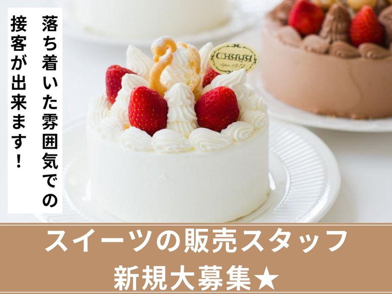 求めている人材 ✅土日祝ご出勤できる方歓迎!! (どちらかご出勤でOK) ✨スイーツ好きな方! ✨人と接することが好きな方! ✨繁忙期(クリスマス・年末年始等)に 出勤可能な方! ✨未経験OK! ✨学生さん活躍中 ⭐女性活躍中 ⭐学生OK!大学生歓迎