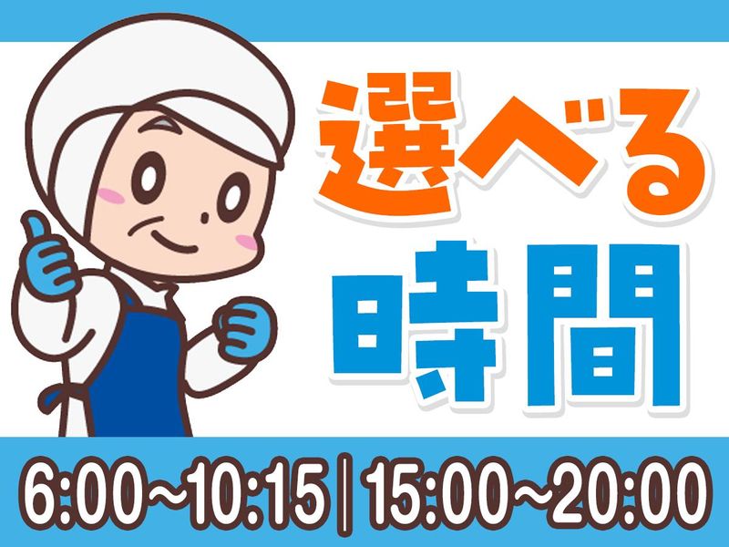 勤務時間詳細 ① 6:00~10:15(実4h) ② 15:00~20:00(実4.75h) ①②からお好きなお時間選べます! ※月13日~15日程度出勤できる方歓迎 希望の働き方を教えて下さい♪ ★土日も働ける方、ご協力お願いします!! ★「土日、全部でなければ大丈夫です」もちろん大歓迎です。