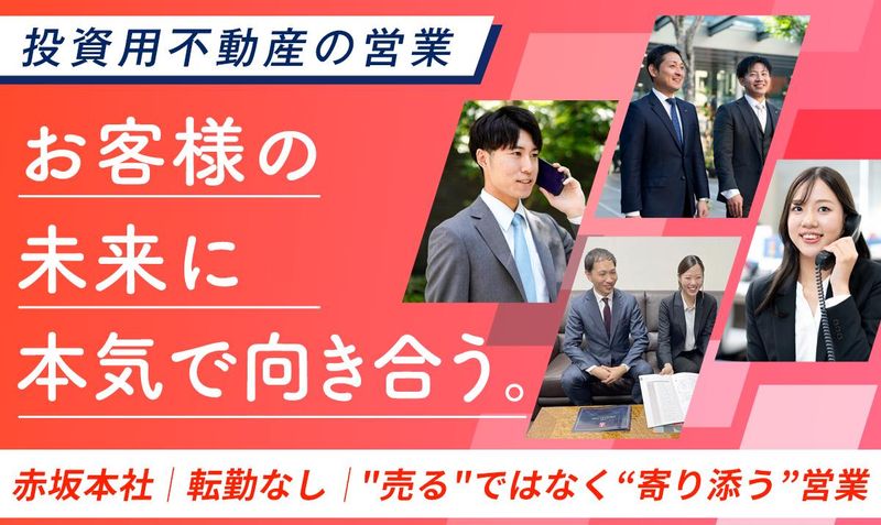 仕事内容 仕事内容について ――――――――――――― 投資用マンションの 提案営業をお任せします。 一人ひとりの価値観、 ライフプランに丁寧に耳を傾け、 信頼関係を築きながら、 最適な資産運用の形をご提案します。 ⏩仕事の進め方は? 電話でアポイント取得 ※チーム制でフォロー体制が充実しています ↓ 全国各地に出張し交渉・提案 ※場合によってはWEBで対応 ↓ 契約・アフターフォロー ※契約締結後は、自社の管理部門へ引き継ぎます ⏩入社後の流れは? 基礎研修、商品理解 ↓ 先輩社員とのロープレ・商談同席 ↓ 定期的なフィードバックと面談 未経験スタートでも、 早い方で1年後には 独り立ちを目指せます! 風通しのいいフランクな雰囲気で 気軽に相談できる環境です。