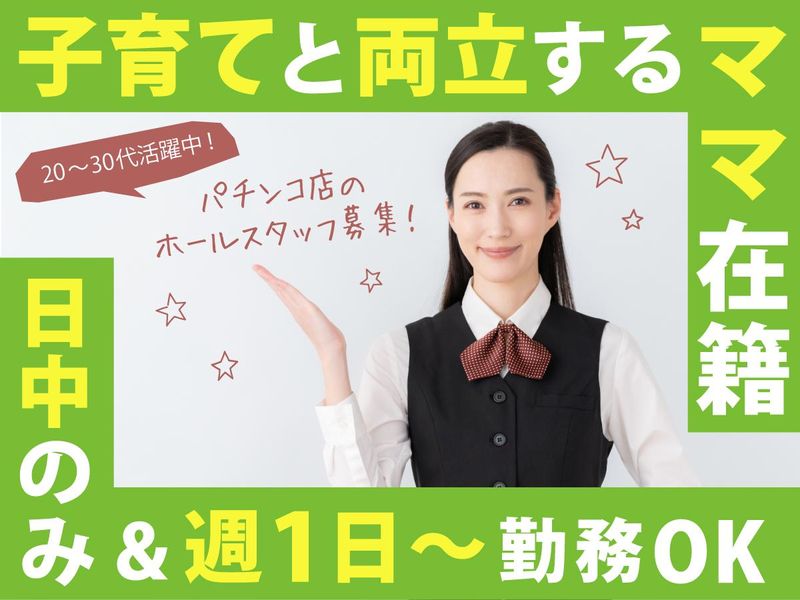 仕事内容 ⭐新着⭐ \昼間のみ&週1日~勤務OK/ 「子育てしながらしっかり稼ぎたい」 「かけもちしてプラスαの収入を得たい」 なんて方にぴったりのお仕事! ご家庭やプライベートと両立して ムリのない働き方を叶えませんか?? < こんなお仕事です! > 地域密着型のパチンコ店 『ゴーゴーセブン』で ホール・カウンタースタッフとして ご活躍いただきます。 具体的には: ホール業務(単純作業多め!) ・お客様への挨拶、お出迎え ・お困りのお客様のサポート カウンター業務 ・景品の交換、補充、在庫チェック ・清掃 ※玉運びやドル箱などの重い荷物は スタッフ同士で協力し合って運びます < 丁寧な研修あり > パチンコ店勤務がはじめてだった スタッフはなんと8割! だから、未経験の方も大丈夫です。 研修制度はバッチリ整っていますし、 ベテランの先輩からのサポートも 手厚いのでご安心ください!