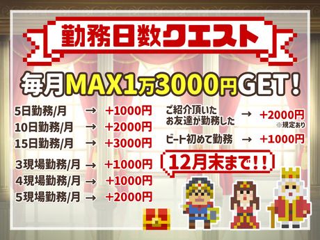 待遇・福利厚生 【福利厚生】 ・日払いOK(規定) ・初回稼働で1000円プレゼント(規定) ・友達紹介で2000円プレゼント(規定)