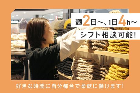 シフト制 勤務時間 9:30~21:15 ◆週2日~、1日4h~相談OK! ◆ご希望の時間に合わせて勤務可能! 学校やプライベートと両立しながら 働きたい学生さんにぴったり◎ 扶養内で働きたい主婦さんも応援! 「授業や部活が終わってから」 「テスト前は勉強に専念したい」 「テストが終わったらシフトを増やしたい」 「週末はフルタイムで働きたい」…etc 柔軟に対応しています◎ シフトの相談もしやすく、 学業優先で働きたい方におすすめです♪