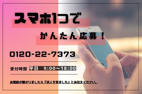 選考プロセス リモート面接(約30分) 遠慮なく何でもお話ください♪ ↓ 工場見学(約1時間) 実際に働いて頂く職場を自分の目で確認! ※工場最寄り駅から送迎、もしくは現地集合 ↓ 入社手続き(約1時間) 書類記入や入社前教育を行います ↓ 入社 最短で1~1.5週間で入社が可能です 入社日の調整も可能!面接時にご相談ください♪ 【問合せ先について】 問合せ先:0120-227-373 【お電話での応募はこちら】 0120-22-7373 応募受付センター (受付時間:平日9時~18時) 求人番号:it-12160189 応募方法 応募するボタンをクリック ↓ 3営業日以内に弊社からメッセージまたは電話にて ご連絡をさせて頂きます。 メッセージのチェックをお忘れなく(*^^)v ※応募多数の場合は書類選考の可能性あり