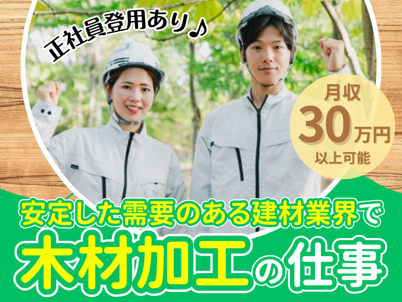 仕事の内容 \高月収可能・木材加工スタッフ募集!/ 残業もあって、月収30万円以上も可能 派遣からスタートして、安定の正社員キャリアを築こう 【業務内容】 あなたの希望や適性に合わせて、 以下のような木材加工をお任せします。 ◇原木を機械でカットして板に加工 ◇接着剤を塗る機械の操作(難しい作業なし) ◇板を重ねて圧着(プレス機の操作) ◇サイズ調整や表面の仕上げ ◇検品・梱包・出荷準備 どの工程も、最初は先輩がしっかりサポート! 「体を動かすのが好き」「コツコツ作業が得意」 そんな方ならスグに慣れます◎  ̄ ̄ ̄ ̄ ̄ ̄ ̄ ̄ ̄ ̄ ̄ ̄ ̄ ̄ ̄ 【会社紹介】 住宅建材に使われる大型合板を製造している工場です。 木材を機械で加工し、原木から建材製品へと仕上げていきます。 安定した需要のある建材業界で、技術を身に付けながら活躍できる環境です。  ̄ ̄ ̄ ̄ ̄ ̄ ̄ ̄ ̄ ̄ ̄ ̄ ̄ ̄ ̄ 【こんな方にピッタリ!】 ・そろそろ腰を据えて働きたい ・派遣やフリーター生活から卒業したい ・ゆくゆくは正社員になりたい 「経験がないから不安…」そんな方も大丈夫! まずは派遣スタッフとしてスタートし、実績に応じて正社員登用もあります。 “モノづくりの現場で手に職”をつけながら、安定したキャリアを築けます。  ̄ ̄ ̄ ̄ ̄ ̄ ̄ ̄ ̄ ̄ ̄ ̄ ̄ ̄ ̄