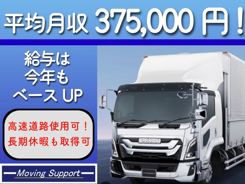 仕事内容 【新着求人】 正社員4tドライバー募集 ================ ✨【はぐくみ企業年金制度あり!】 ⇒ 従業員が安心して働ける環境◎ ✨平均月給37万円! ✨座学OJTによる充実の研修体制! ✨転勤無しなので安心して働けます! ================ 【お仕事の詳細】 埼玉久喜営業所への幹線輸送をお任せします 工業製品の長距離輸送がメインとなります。 *移動距離:片道1200㎞程度 *高速道路の使用有 *配送するもの:建築資材やケース物 *積み下ろし:リフトまたはバラ 【仕事の流れ(例)】 4泊5日の配送スケジュールの一例です 月曜日:福岡本社出発 火曜日:移動 水曜日:久喜営業所到着、同日に荷物積み替え出発 木曜日:移動 金曜日:福岡本社到着 *配送するもの等で、コースや 日程が変更することもございます。 運転が好きな方にピッタリなお仕事です。 【社員インタビュー】 大型ドライバーは全くの未経験でしたが、 楽しく働けています。 最初の面接時もとても丁寧で、 しっかりと自分のお話を 聞いてくれたのが好印象でした。 長距離を移動するという性質上、色々な地域に行きますが、 そこで名物料理や温泉など、まだ見つけていない 「良いもの」を探す、そんなことも楽しみの一つ。 車両も共用ではなく専用なので、 車の中に好きなアーティストや キャラクターのグッズを置いている方もいます! もちろん自分も置いています! サービスエリアで同僚と偶然会ったりなど、 運転だけじゃない楽しみも多い職場だと思います! (入社3年目、Tさん) 【安心できる職場環境】 入社後、座学とOJTにより研修を行います。 1人前になるまで先輩社員が丁寧に お教えいたしますのでご安心ください。 分からないことは気軽に相談できるため、 安心して無理せず一緒に働きましょう! 1人前になってからもサポート体制◎! 長距離運行の安全管理を徹底しており、 法定の運行時間・休憩時間の厳守。 全車にドライブレコーダー、 デジタコを完備し、 ドライバーの安全を守っています! さらに転勤無しなので、 環境の変化が無く安定した生活を送れます! 【会社案内】 平成18年設立の当社。 九州地方から関東地方と幅広いエリアで、 一般貨物輸送/長距離輸送を行っている物流会社です。 福岡に本社を構え、大阪や埼玉に倉庫を 展開しており、今後も拠点を展開予定です。 この度業績好調につき正社員増員募集いたします! 【企業HP】 http://www.moving-support.co.jp/