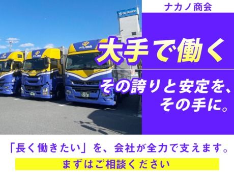 仕事内容 新規営業所オープニングスタッフ募集!20名採用予定!<10tトラックドライバー> \\2025年8月1日オープンの新規営業所// 【ヤマトグループ】の大手物流企業 【ナカノ商会】でドライバーデビュー しませんか? オープニングスタッフや 20代~50代のスタッフも活躍中! 【お仕事詳細】 大手通販会社の依頼で安定! 指定センターから荷物を集荷 →積込み →指定センターに配送 →積降ろし →次のセンターへ 1日3コース程のルート配送 ※繁忙時は変動 ≫≫≫≫≫≫≫≫≫≫≫≫≫≫≫≫≫≫≫≫≫≫ ◆1日の走行距離:200kmほど ◆積荷作業時間:1回30分ほど ≪≪≪≪≪≪≪≪≪≪≪≪≪≪≪≪≪≪≪≪≪≪ ++++++++++++++ 当社のおすすめポイント ++++++++++++++ *入社祝い金6万円あり! *月9日休み+有給休暇 *福利厚生充実 *転勤なし! *パレットカゴ車メイン! 手積み・手降ろしはほぼなし! パレットはハンドフォークにて積み込みなので、 フォークリフトの免許がなくてもOK *全国展開中<勤務地は希望考慮> *労務管理が整っており 休日はしっかり取れます! *勤務時間もある程度決まっているため 予定も立てやすい! +++++++ 充実の手当 +++++++ 入社祝金 資格取得支援 退職金 寸志 特別手当 …その他多数! ■会社の特徴 <超大手通販会社からの依頼多数> 従業員3000名以上を有し、 全国に37拠点を展開している当社。 会社としての安定性はバッチリです! 安定企業だからこそ実現できる 充実の待遇もあり、乗務員満足度も高め! 既存営業所は定着率もバツグンで、 立ち上げから長く 勤続してくれている方ばかりです◎ ≫≫≫≫≫≫≫≫≫≫≫≫≫≫≫≫≫≫≫≫≫≫≫≫≫≫≫≫ キャリアアップ・ジョブチェンジも可! ≪≪≪≪≪≪≪≪≪≪≪≪≪≪≪≪≪≪≪≪≪≪≪≪≪≪≪≪ 事業拡大により管理職などの ポジションにも空きがあるため、 ドライバーからリーダー職などの 管理職を目指すこともできますよ◎ 年齢やキャリア、ライフステージに よってドライバーから内勤などへの ジョブチェンジも可能です! ■充実の研修制度あり!同乗研修は20時間以上! <ドライバー初心者からも安心の声多数> 法定通りの座学や添乗研修をしっかり行います! 大型免許があればドライバー経験不問! イチからしっかり教えます! ドライバーの基本から同乗研修まで 経験がある方も学びなおしになると好評◎ ■高月給&月9日休み+有休しっかりとれる! 業績は右肩上がりで、 大手物流に関わっているため安定◎ ドライバー未経験でも高月給35万円~! 無理なく働けるよう「4日勤務⇒2日休み」 などのシフト組をしています。 有給休暇が取りやすい環境です! プライベートも大切にしながら働けます! 長く働ける環境が整っています。 ■先輩インタビュー ●10tドライバー Tさん(28歳)/入社3ヶ月目 Q:前職と転職のきっかけは?  ̄ ̄ ̄ ̄ ̄ ̄ ̄ ̄ ̄ ̄ ̄ ̄ ̄ ̄ ̄ ̄ ̄ ̄ 前職は元々ドライバーをやっていました。 転職のきっかけは 前職での人間関係に悩んでいた時に 現場でナカノ商会の社員と 何度か遭遇することがあって… 思い切って悩みを話したら、 雰囲気がよさそうだなという 印象があったので、 ここに転職しようと思いました。 Q:ナカノ商会を選んだ理由は?  ̄ ̄ ̄ ̄ ̄ ̄ ̄ ̄ ̄ ̄ ̄ ̄ ̄ ̄ ̄ ̄ ̄ ̄ 前職の業務内容とほぼ相違がなく、 何より人間関係も良く働きやすそうだと 思ったからです。 給与や休日の制度が 整っていたのも自分的には刺さりました。 あと、ドライバー経験が少ない人にも おすすめポイントがあって、 研修がかなり充実してるので 運転がうまくなると思いますよ! =================== ●10tドライバー Kさん(25歳)/入社6ヶ月目 Q:転職のきっかけは?  ̄ ̄ ̄ ̄ ̄ ̄ ̄ ̄ ̄ ̄ ̄ ̄ ̄ ̄ ̄ ̄ ̄ ̄ 紹介で入社しました。 免許は、入社前に取得してました。 ドライバーやるかどうか 未定だったけど、とりあえず取得した という感じです。 Q:ナカノ商会を選んだ理由は?  ̄ ̄ ̄ ̄ ̄ ̄ ̄ ̄ ̄ ̄ ̄ ̄ ̄ ̄ ̄ ̄ ̄ ̄ 紹介されたというのが一番ですが、 自分が色々と検討してきた中で 給与がいいという事と、休みが多い というのが良かったなと思ってます。 あと、社内の雰囲気がいいし、 土日も休みが取れるのも良かったです。 土日休みの友人が多いので、 予定を合わすことができます。 =================== ●10tドライバー Aさん(29歳)/入社10ヶ月目 Q:前職と転職のきっかけは?  ̄ ̄ ̄ ̄ ̄ ̄ ̄ ̄ ̄ ̄ ̄ ̄ ̄ ̄ ̄ ̄ ̄ ̄ 前職は車の整備をやったり ドライバーもやっていました。 でもそこの会社は中型のトラックまで しか扱ってなくて、 ステップアップのために大型も扱う所を 探していました。 Q:ナカノ商会を選んだ理由は?  ̄ ̄ ̄ ̄ ̄ ̄ ̄ ̄ ̄ ̄ ̄ ̄ ̄ ̄ ̄ ̄ ̄ ̄ 業務内容的に前職と同じような感じだと いう事と、残業などの労務管理がしっかり していて、うやむやじゃないってことが 大きかったです。 働く時間も選べます。自分は日勤固定。 安定した収入がいただけてるので、 満足しています! もし転職する目安が福利厚生なら、 ウチはドライバー職の中でも わりと整って