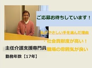 PR 資格を活かし高齢者の在宅生活を一緒に支援しませんか? やさしい手の浅草在宅支援では、ケアマネージャーを大募集しています。 浅草駅から徒歩7分。事務所のあるマンションの前に都営バス二天門のバス停があり、複数の沿線も利用でき通勤に便利です。東京スカイツリーのイルミネーションや桜の季節など移動中も気分転換できます 事務所では、各自専用パソコン用意。操作も簡易ソフトを使い帳票等を作成。あなたの経験を生かしてください。男性、女性大歓迎です 現在主任介護支援専門員が4名在籍しているので、主任ケアマネジャー資格をもっているからといっても管理者をやらなくても大丈夫です。ケアマネジャー業務に集中したい方、経験豊富なケアマネジャーが7人在籍しているので、フォローできます。 【キャリアアップ】 やさしい手では人事ローテーション制度により、定期的な異動があります。 ご本人主体で異動を検討しますので、一方的に異なる職種に替るということはありません。 ケアマネジャーとして入社した場合でも、包括支援センターの相談職に就くことや、経営的な部門での業務にシフトすること、本社部門での業務など、さまざまな道があります。 専門性を極めたい方、経営に関わる仕事をしたい方など、様々なキャリアアップを実現させることができます。 【資格取得】 主任ケアマネジャー更新費用、 認定ケアマネジャー取得費用全額会社負担いたします。(規定あり) 【コロナ対策】 デスクにはアクリル板で飛沫を防ぐ等の予防策を行い、時差出勤やWEBの活用も行っています。 いかがでしょうか。ご応募をお待ちしています やさしい手のYouTubeの一覧はこちらからご覧いただけます。 https://www.youtube.com/channel/UC5JwsErtPVT_I3SdsTXVxmg 会社説明動画はこちら 当社の魅力を25秒でご覧いただけます ぜひ動画をチェックしてください。 https://youtu.be/5jPQPpIQ7dk