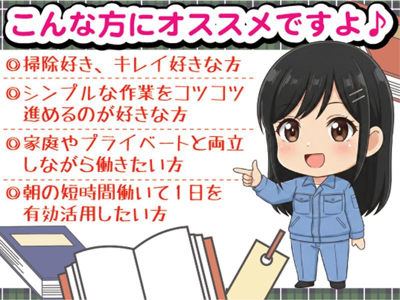 求めている人材 ◆未経験者大歓迎! ◆主婦(夫)大歓迎! ◆Wワーク・副業大歓迎! ◆外国人採用実績多数あり (日本語での会話・指示理解ができる方) ◆シニアも大勢活躍中! 【こんな方にオススメ】 ◎ハローワークでお仕事を探されている方 ◎シンプルな作業をコツコツ進めるのが 好きな方 ◎家庭やプライベートと両立しながら 働きたい方 ◎掃除好き、キレイ好きな方 ◎早朝働きたい方 ◎短時間パートしたい方