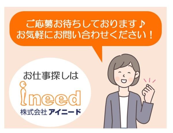 仕事内容 【新工場オープニングスタッフ募集】 未経験OK!かんたん軽作業♪女性活躍中 新しく完成した工場でのスタートメンバーを大募集! 空調完備の清潔な職場で、快適にお仕事できます。 ・ 検査作業 完成したチューブに、傷や汚れがないかを 目視でチェックするだけのシンプル作業です。 ・袋詰め・ラベル貼り 検査が終わった製品を専用の袋に入れ、 ラベルを貼る作業です。 ▶ 重い物ナシ ▶ 複雑な作業ナシ ▶ コツコツ・モクモク作業が好きな方にぴったり! 未経験の方でもしっかり教育があるので安心してお仕事スタートできますよ☆ :+:・-・:+:・-・:+:・-・:+:・-・:+:・-・:+: 【職場見学OK】 事前に工場見学できますので、職場の雰囲気やお仕事内容確認してからお仕事スタートできますよ! お仕事も丁寧に教えていきますので、未経験者の方も安心してください! 見学の際には弊社スタッフが同行し、 和やかな雰囲気で、ざっくばらんに質問もできますよ。 :+:・-・:+:・-・:+:・-・:+:・-・:+:・-・:+: 【日払い・週払いシステム】 アイニードは勤怠実績に応じ、給与の一部を 日払い・週払いでもお支払い可能♪ 困った時でも最短2日で受け取ることが出来ます♪ 残りの分は給与日にまとめてお支払いします◎ 応募の前に詳しく聞きたいという方も遠慮なく問い合わせください! :+:・-・:+:・-・:+:・-・:+:・-・:+:・-・:+: 【応募&お問い合わせ】 細かいことでもお気軽にお問い合わせください♪ ご応募は応募フォームかお電話、ショートメッセージでもOKです。 気になったらとりあえずご応募いただいて、それからご検討してもらってもOK 女性スタッフが対応☆寄り添ってお仕事探しをサポートいたします! :+:・-・:+:・-・:+:・-・:+:・-・:+:・-・:+: