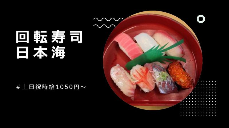 仕事内容 *‥‥*‥学生さんが活躍中!‥*‥‥* ⏩高校生さん バイトデビューしたばかりなので 1日4時間で無理なくお仕事◎ ⏩学生さん 勉強やサークルと両立したいので 平日授業終わりや土日に週3日でお仕事♪ *‥‥*‥‥*‥‥*‥‥*‥‥*‥‥* ▽ ▽ ▽ ▽ ▽ *…・―――――――――――――・…* ⭐\\ この求人のポイント //⭐ ✨ 未経験OK◎丁寧な指導で安心♪ ✨ バイトデビューも歓迎! ✨ 絶品まかないあり!持ち帰りもOK◎ ✨ 従業員割引でお寿司は半額に! ✨ 平日のみ・土日のみの勤務もOK! *…・―――――――――――――・…* ▼∴▼∴▼∴▼∴▼∴▼∴▼∴▼∴▼∴▼∴ ――――――――――――――――――― ⭐ 今回募集するお仕事は…  ̄ ̄Ⅴ ̄ ̄ ̄ ̄ ̄ ̄ ̄ ̄ ̄ ̄ ̄ ̄ ̄ ̄ ̄ ̄ 回転寿司日本海にて 店舗スタッフを募集します! ▼∴▼∴▼∴▼∴▼∴▼∴▼∴▼∴▼∴▼∴ ――――――――――――――――――― ⭐ 具体的なお仕事内容は…  ̄ ̄Ⅴ ̄ ̄ ̄ ̄ ̄ ̄ ̄ ̄ ̄ ̄ ̄ ̄ ̄ ̄ ̄ ̄ ✅ホール業務 └ 機械を使用してお皿の枚数チェック └ テーブル片付け・セッティング └ レジ業務 └ サイドメニュー配膳 など ✅調理補助業務 └ 機械を使用して軍艦寿司の製造 └ 洗い場作業 など ホール業務と調理補助業務の 両方を担当していただきます。 *・。。・'・。。・'・。。・'・。。・'・。。・'・。。・。。・'・。。・* まずは笑顔で元気に「いらっしゃいませ!」 とお客様をお迎えできれば大丈夫です♪ 明るい対応で接客をお願いします! 調理補助作業は「料理が好き!」という方や 細かい作業が得意な方にぴったりです◎ ▼∴▼∴▼∴▼∴▼∴▼∴▼∴▼∴▼∴▼∴ ――――――――――――――――――― ⭐ 未経験でも安心の環境◎  ̄ ̄Ⅴ ̄ ̄ ̄ ̄ ̄ ̄ ̄ ̄ ̄ ̄ ̄ ̄ ̄ ̄ ̄ ̄ \✨未経験でも安心してスタート✨/ 平日の落ち着いた時間帯に、基礎から ステップアップ形式で指導いたします。 「飲食業界は初めてで…」という方や 「今回が初めてのアルバイトで緊張する」 という方も心配はご無用です! \✨2週間の丁寧な研修あり✨/ 最初の1週間は、先輩スタッフが マンツーマンでお皿の数え方や レジ操作などを教えます。 2週目から、簡単な調理補助にも挑戦! あなたのペースに合わせて進めるので、 焦らず仕事を覚えられますよ。 ▼∴▼∴▼∴▼∴▼∴▼∴▼∴▼∴▼∴▼∴ ――――――――――――――――――― ⭐ あなたに合わせた働き方でOK!  ̄ ̄Ⅴ ̄ ̄ ̄ ̄ ̄ ̄ ̄ ̄ ̄ ̄ ̄ ̄ ̄ ̄ ̄ ̄ 週単位でシフトを組んでいます。 予定が立てやすく、無理なくプライベートと 両立できる環境ですよ◎ ▼∴▼∴▼∴▼∴▼∴▼∴▼∴▼∴▼∴▼∴ ――――――――――――――――――― ⭐ とある1日の流れ(ディナータイムの例)  ̄ ̄Ⅴ ̄ ̄ ̄ ̄ ̄ ̄ ̄ ̄ ̄ ̄ ̄ ̄ ̄ ̄ ̄ ̄ 17:00 出勤、準備 17:30 お客様対応などホール業務 19:00 ピークタイム! チームで協力して対応 20:00 洗い場や簡単な調理補助 21:00 退勤!お疲れ様でした♪ ▼∴▼∴▼∴▼∴▼∴▼∴▼∴▼∴▼∴▼∴ ――――――――――――――――――― ⭐ 当店について  ̄ ̄Ⅴ ̄ ̄ ̄ ̄ ̄ ̄ ̄ ̄ ̄ ̄ ̄ ̄ ̄ ̄ ̄ ̄ 長年にわたり、お客様に上質なお寿司と 心温まるひとときを提供してまいりました。 働くスタッフ同士が支え合い、 温かな職場環境を大切にしています。 *・。。・'・。。・'・。。・'・。。・'・。。・'・。。・。。・'・。。・* 仕事で頑張った後には、 職人さんが握る美味しいお寿司の まかないが待っています。 家に持って帰ることもできるので、 「家族も喜んでいる」と 話しているスタッフもいます♪ *・。。・'・。。・'・。。・'・。。・'・。。・'・。。・。。・'・。。・*