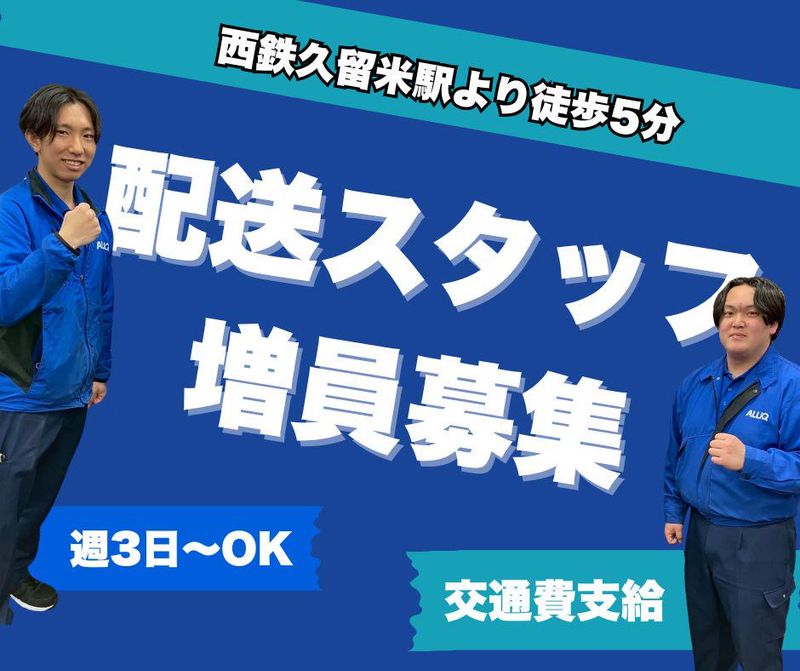仕事内容 オーリック久留米店 アルバイト・パートスタッフ大募集! *:.+*:.+*.:+.:*:.+.:*:.+*:.+*:.+.:* ✅西鉄久留米駅より徒歩5分 ✅車・バイク・自転車通勤もOK ✅交通費支給アリ(規定有) ✅軽バンでの配送です◎ *:.+*:.+*.:+.:*:.+.:*:.+*:.+*:.+.:* ✨お任せするお仕事は・・・✨ ー 顔なじみのお客様へ、軽バンで商品をお届けします! 久留米店は、日中の配送が中心でルート配送が多いため あまりバタつくことなく業務を進めることができます◎ 配送へ出発する前の積み込み作業は、 他のスタッフもサポートします! 慣れてくるとお取引先と仲良くなることもあり、 「配送先でのお客様と顔を合わせるのも楽しみの一つ」というスタッフもいます♪ ✨男女問わず活躍中です✨ ー 久留米店では、女性スタッフも活躍中! 2tトラックもありますが、軽バンでの配達をお任せしますので、 トラックでの配送は怖いという方も安心してください◎ ★:主婦さんも活躍中! ★:学生さんも活躍中! ★:フルタイム勤務も大歓迎! ✨ 正社員登用制度あり ✨ ー ★将来は正社員での就職を目指したい! ★徐々に責任のある業務に携わりたい! という方も歓迎します◎ 「正社員の求人に応募する勇気がない…」 「ある程度経験してから、考えたい…」という方も、 まずはアルバイトからスタートしてみませんか?