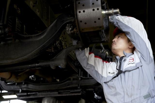 仕事情報 ● 仕事内容 トラックやバス、特殊車両の整備・鈑金・塗装・修理業務などを お願いします。大型車両を扱うことが多いため、チームで手分け して行います。整備は車検・一般整備。鈑金はフレーム修理・ パテ修理。修理は部品交換から部品を分解しての調整など様々。 まずはエンジンオイルの交換など簡単な整備から始めましょう。 大手ならではの安定感 当社は「ヒノノニトン」でおなじみ、トラック・バスの リーディングカンパニー日野自動車の販売店として国内最大級の 規模を誇ります。日野自動車の主力商品といえば、トラックや バスといった人やモノを運ぶ大型車。国内トップクラスシェアの 為、メンテナンス需要も高く、仕事量も安定しています。 一人前になるまで育てます 技術を見て盗む場面も若干ありますが、大半の仕事は先輩が丁寧 に指導・サポートします。オーダーメイドでカスタムされた車両 に携わる機会も多いため、同じ仕事が少ないのもありますが、 一人前になるまで時間がかかって当たり前。成長スピードに 合わせて仕事の幅を徐々に広げていけば大丈夫です。 報・連・相の徹底 私達がお預かりする車両はドライバーの商売道具です。整備ミス がある状態で納車し、事故やトラブルが起きてしまってはお客様 の商売を止めてしまうことに。そうならないためにも「報告・ 連絡・相談の徹底」といった社会人として当たり前の振舞いをす ることはスタッフ同士だけでなくお客様の信頼にも繋がります。 気さくな先輩ばかり 現在活躍するスタッフは20代~50代と幅広いです。仕事を教える という面倒見の良さはもちろん、仕事が終わってからサクッと 一緒にご飯に行く人も多いです。(飲み会はだいぶ少ないです) 車好きも多いので、車の話で盛り上がることもしばしば。 仕事だけでなくプライベートなことも相談しやすい関係です。