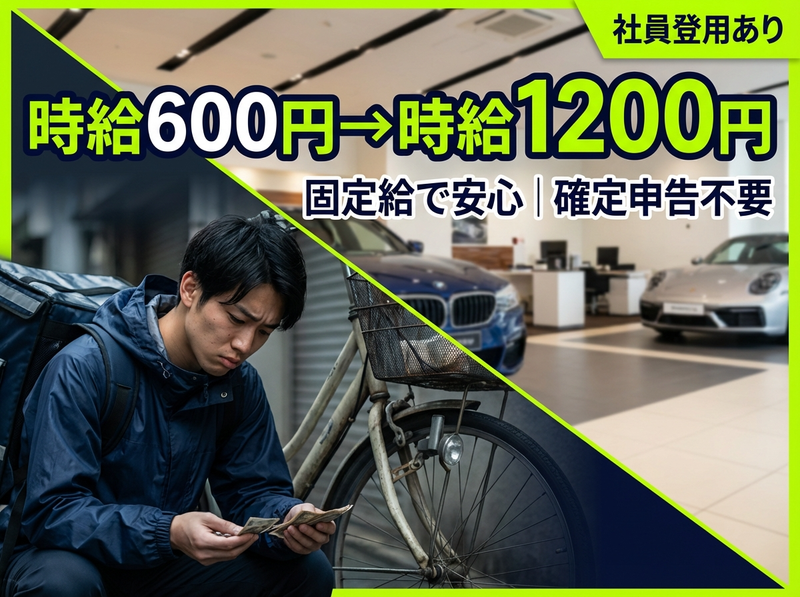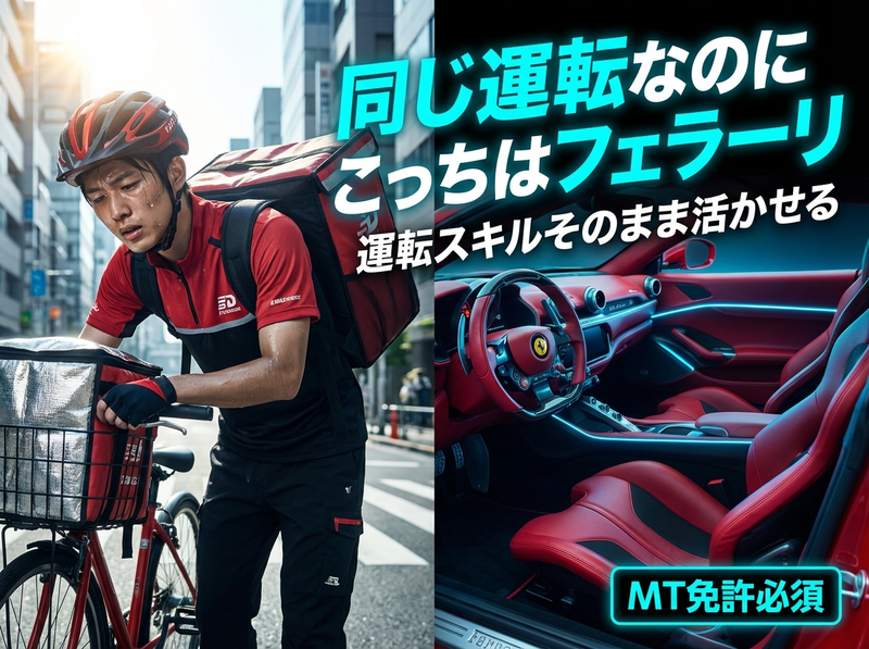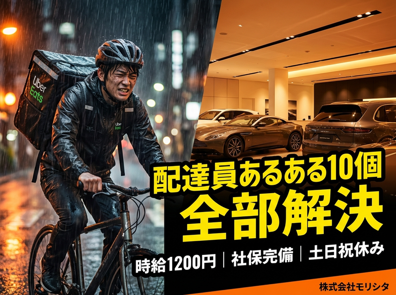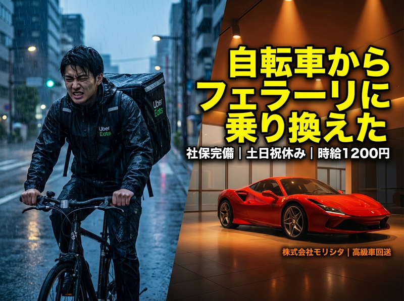 仕事内容 【配達員あるある10個、全部当てはまったら読んでくれ】 元配達員だった俺が書く。 全部実体験。 1個でも「わかる」って思ったら、 最後まで読んでほしい。 ━━━━━━━━━━━━━━━ あるある① 「雨の日、稼げるけど死ぬ」 ━━━━━━━━━━━━━━━ 雨の日はブーストかかる。 だから稼ぎたくて出る。 でも路面は滑る。 視界は悪い。 スマホの画面に水滴がついて ナビが見えない。 マンションの前で滑って転んだ。 商品ぐちゃぐちゃ。 ズボン破れた。膝から血。 でも配達は止められない。 「もうやだ」って思いながら 次の注文を受けてた。 →【今】雨の日もエアコンの中。 ワイパー動かすだけ。 車の中は快適。音楽聴きながら運転。 ━━━━━━━━━━━━━━━ あるある② 「確定申告がダルすぎる」 ━━━━━━━━━━━━━━━ 配達員は個人事業主。 年末に領収書の山と向き合う。 自転車の修理代、スマホホルダー、 モバイルバッテリー、レインウェア。 経費ってどこまで? 税理士に頼む金もない。 e-Taxと3時間格闘して 結局よくわからないまま提出した。 →【今】給与天引き。確定申告不要。 年末調整は会社がやってくれる。 この解放感、やった人にしかわからない。 ━━━━━━━━━━━━━━━ あるある③ 「事故っても自己責任」 ━━━━━━━━━━━━━━━ 信号待ちで後ろからタクシーに突っ込まれた。 労災? ない。個人事業主だから。 治療費は自分持ち。 配達できない間の収入はゼロ。 保険も自分で入るしかない。 「働けなくなったら詰む」 この恐怖、常にあった。 →【今】社保完備。労災あり。 万が一の事故も会社が守ってくれる。 この安心感だけで転職した価値がある。 ━━━━━━━━━━━━━━━ あるある④ 「アプリが鳴らない日の絶望」 ━━━━━━━━━━━━━━━ 昼のピークが終わった14時。 アプリが沈黙する。 マックの駐車場で30分待機。 鳴らない。 「今日もう終わりかな」 時給換算したら600円だった日がある。 でも誰にも文句は言えない。 鳴らないのは俺のせいじゃないのに。 →【今】時給1,200円固定。 8時間で9,600円。毎日確実に。 アプリの機嫌に振り回されない。 ━━━━━━━━━━━━━━━ あるある⑤ 「体がボロボロ」 ━━━━━━━━━━━━━━━ 夏は熱中症寸前。 冬は指の感覚がなくなる。 膝が痛い。腰が痛い。 自転車のサドルで尻が死ぬ。 25歳なのに体は40代みたいだった。 →【今】車の中。座ってる。 エアコンあり。シートヒーターあり。 高級車のシートって、めちゃくちゃ良い。 腰痛が治った。マジで。 ━━━━━━━━━━━━━━━ あるある⑥ 「Bad評価が怖い」 ━━━━━━━━━━━━━━━ 5分遅れただけで低評価。 商品が傾いてたら低評価。 インターホン押し間違えたら低評価。 評価が下がるとブーストもらえない。 ブーストもらえないと稼げない。 顔も知らない客に 自分の評価を握られてる感覚。 地味にメンタルやられる。 →【今】評価制度なし。 車を安全に届ければOK。 先輩に「今日もお疲れ」って言われる。 それだけで救われる。 ━━━━━━━━━━━━━━━ あるある⑦ 「友達に説明しにくい」 ━━━━━━━━━━━━━━━ 「仕事何してるの?」 「UOOOOOatsの配達」 「あー……」 この「あー」に全部詰まってる。 バイト以下に見られてる感覚。 →【今】「高級車を運転して届けてる」 「え、何それすごい」 この反応の差。 自己肯定感が全然違う。 ━━━━━━━━━━━━━━━ あるある⑧ 「土日が稼ぎ時で休めない」 ━━━━━━━━━━━━━━━ 土日はオーダーが多い。 だから休めない。 友達の誘いを断り続けた。 「ごめん、今日配達ある」 このセリフ何回言っただろう。 →【今】土日祝休み。完全に。 友達と遊べる。旅行に行ける。 普通の生活が戻ってきた。 ━━━━━━━━━━━━━━━ あるある⑨ 「将来が見えない」 ━━━━━━━━━━━━━━━ 3年配達員やっても、 5年やっても、 スキルは「土地勘」だけ。 30歳になった時、 履歴書に「配達員」しか書けない。 その恐怖は年々大きくなる。 →【今】社員登用制度あり。 中型・大型免許の取得費用補助あり。 バイトから正社員になった先輩がいる。 「ここにいれば将来がある」と思える。 ━━━━━━━━━━━━━━━ あるある⑩ 「やめたいのにやめられない」 ━━━━━━━━━━━━━━━ 明日から行かなくていい自由。 それが逆に呪いになる。 「いつでも辞められる」から いつまでもダラダラ続けてしまう。 他のバイト探すのも面倒。 気づいたら2年経ってた。 →【今】9時に出勤して18時に帰る。 リズムがある。仲間がいる。 「ここに居場所がある」って思える。 初めてバイトを続けたいと思った。 ━━━━━━━━━━━━━━━ 10個中、何個当てはまった? ━━━━━━━━━━━━━━━ 7個以上なら、そろそろ限界だと思う。 俺は10個全部だった