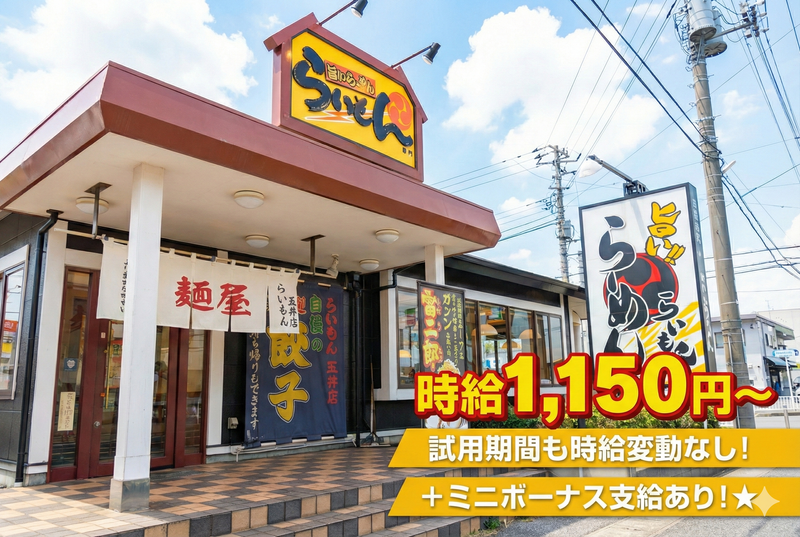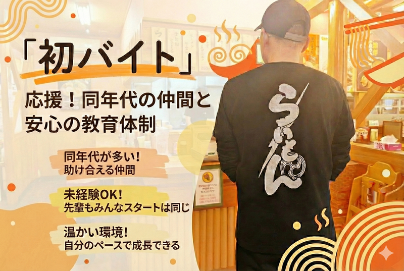 仕事内容 \ バイトデビュー歓迎!! / 「一人だと不安だけど、 同世代の仲間と一緒なら心強い★」 そんな先輩たちが活躍中の職場です! ⭐週1日・3h〜OK! 学業や家庭との 両立がしやすい柔軟シフト ⭐時給1150円スタート! 試用期間中も条件変更なしで安心 ⭐未経験歓迎! 優しい先輩がイチから 丁寧にお教えします ⭐髪型・髪色自由! 自分らしく、 個性を大切に働ける職場 ⭐ラーメン激戦区の人気店! 活気ある雰囲気で楽しく働けます ⭐食事補助や能力・ 業績に応じたミニボーナスなど 嬉しい待遇あり ▼主なお仕事 ・お客様のご案内 ・オーダーの確認 (笑顔で対応できればOK!) ・お料理やドリンクの提供 ・お席の片付け など まずは「いらっしゃいませ!」 と元気な挨拶ができれば大丈夫です! 先輩が一つひとつの動作を ゆっくり丁寧にお伝えしますので、 バイトデビュー/飲食未経験の方も 自分のペースで慣れていってくださいね。